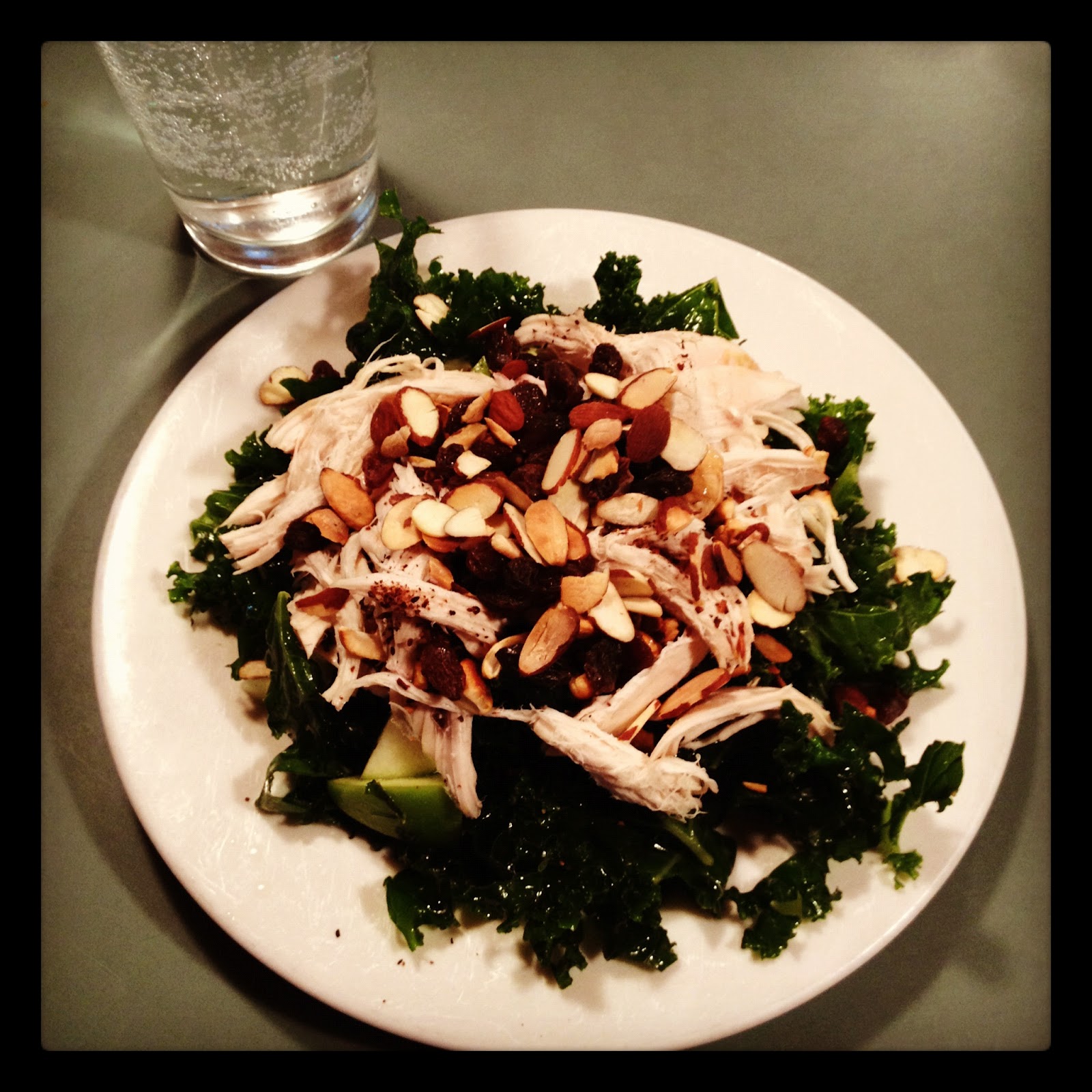 Late afternoon | 2-3 cups kale salad, 3-4oz. roasted chicken, toasted slivered almonds