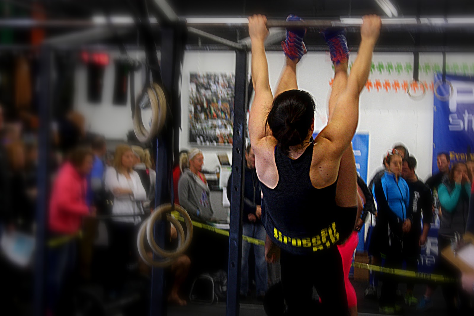 Dana butterfly kipping like a boss. This was Dana’s first major individual competition. She was in the women’s scaled division. For those of you who know Dana, you know that she is a beast and she works very hard in the gym and outside of it. She has been CrossFitting for less than 6 months and she already possesses an extensive tool bag of skills and great movement. The first WOD of the weekend, “Queezy Baby”, was an AMRAP 8min of 6 burpee up-and-over the box and 7 pull-ups. Scaled women had the option of using a blue band for pull-ups. I was unsure as to what Dana was planning on doing for the pull-ups since she can do prescribed pull-ups, but after finishing her first set of burpees she jumped up to the bar and started banging out butterfly pull-ups like it was her job. I just started laughing; you could see her determination. It was a great way to start the day, watching her destroy a WOD. Cannot wait to see where she goes from here!